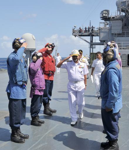 Keywords: US Navy 110407-N-0864H-506 Rear Adm. Harish Bisht salutes side boys while departing USS Blue Ridge (LCC 19) during a visit in support of exercise M.jpg en PHILIPPINE SEA April 7 2011 Rear Adm Harish Bisht flag officer of Commanding Eastern Fleet salutes side boys while departing the U S 7th Fleet command ship USS Blue Ridge LCC 19 during a visit in support of exercise Malabar 2011 Blue Ridge serves under Commander Expeditionary Strike Group ESG 7/Task Force CTF 76 the Navy's only forward deployed amphibious force U S Navy photo by Mass Communication Specialist 3rd Class Fidel C Hart/Released 2011-04-07 110407-N-0864H-506 Navy http //www navy mil/view_image asp id 99748 U S Navy photo by Mass Communication Specialist 3rd Class Fidel C Hart PD-USGov-Military-Navy Aboard USS Blue Ridge LCC-19