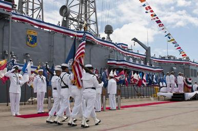 Keywords: US Navy 110421-N-BT887-058 A U.S. Navy color guard parades the colors during the decommissioning ceremony of the guided-missile frigate USS Jarret.jpg en SAN DIEGO April 21 2011 A U S Navy color guard parades the colors during the decommissioning ceremony of the guided-missile frigate USS Jarrett FFG 33 at Naval Station San Diego Jarrett completed numerous deployments conducting theater security cooperation escort duties and counter-illicit trafficking operations U S Navy photo by Mass Communication Specialist Seaman Benjamin Crossley/Released 2011-04-21 110421-N-BT887-058 Navy http //www navy mil/view_image asp id 100255 U S Navy photo by Mass Communication Specialist Seaman Benjamin Crossley PD-USGov-Military-Navy USS Jarrett FFG-33 Photographs of military flags of the United States Color guards of the United States Navy