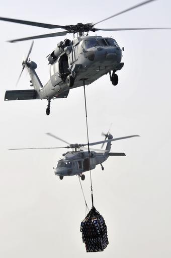 Keywords: US Navy 110519-N-DM338-296 SH-60S Sea Hawk helicopters assigned to the Wild Cards of Helicopter Sea Combat Squadron (HSC) 23 transport pallets from.jpg en ARABIAN GULF May 19 2011 SH-60S Sea Hawk helicopters assigned to the Wild Cards of Helicopter Sea Combat Squadron HSC 23 transport pallets from the Military Sealift Command fast combat support ship USNS Bridge T-AOE 10 to the aircraft carrier USS Ronald Reagan CVN 76 during a replenishment at sea Ronald Reagan and Carrier Air Wing CVW 14 are deployed to the U S 5th Fleet area of responsibility and will be conducting close-air support missions as part of Operations Enduring Freedom and New Dawn U S Navy photo by Mass Communication Specialist Seaman Nicholas A Groesch/Released 2011-05-19 110519-N-DM338-296 Navy http //www navy mil/view_image asp id 101364 U S Navy photo by Mass Communication Specialist Seaman Nicholas A Groesch PD-USGov-Military-Navy USNS Bridge T-AOE-10 Helicopter Sea Combat Squadron 23 United States Navy |