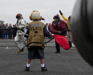 Keywords: US Navy 110613-N-DR144-100 A sponsored tiger cruise participant waves a flag signifying a class bravo fire as flight deck personnel demonstrate air.jpg en PACIFIC OCEAN June 13 2011 A sponsored tiger cruise participant waves a flag signifying a class bravo fire as flight deck personnel demonstrate aircraft firefighting drills to friends and family aboard the Nimitz-class aircraft carrier USS Carl Vinson CVN 70 during the ship's tiger cruise Carl Vinson and Carrier Air Wing CVW 17 recently completed a deployment the U S 5th and 7th Fleet areas of responsibility U S Navy photo by Mass Communication Specialist 2nd Class James R Evans/Released 2011-06-13 110613-N-DR144-100 Navy http //www navy mil/view_image asp id 102534 U S Navy photo by Mass Communication Specialist 2nd Class James R Evans PD-USGov-Military-Navy Aboard USS Carl Vinson CVN-70 People with flags |