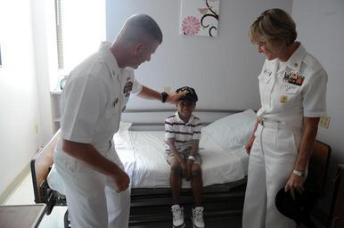 Keywords: US Navy 110614-N-AD372-035 Master Chief Petty Officer of the Navy (MCPON) Rick D. West makes a child an honorary Sailor with a command ball cap fro.jpg en CHATTANOOGA Tenn June 14 2011 Master Chief Petty Officer of the Navy MCPON Rick D West makes a child an honorary Sailor with a command ball cap from U S 7th Fleet command ship USS Blue Ridge LCC 19 during a Caps for Kids event at the T C Thompson Children's Hospital as part of Chattanooga Navy Week Navy Weeks are intended to show Americans the investment they have made in their Navy and increase awareness in cities that do not have a significant Navy presence U S Navy photo by Mass Communication Specialist 1st Class Abraham Essenmacher/Released 2011-06-14 110614-N-AD372-035 Navy http //www navy mil/view_image asp id 102755 U S Navy photo by Mass Communication Specialist 1st Class Abraham Essenmacher PD-USGov-Military-Navy Boys of the United States Chattanooga Navy Week Sitting boys Three people Two males