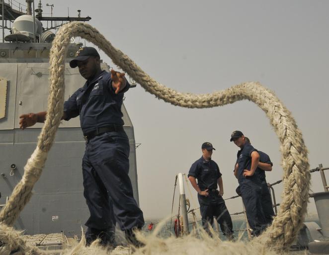 | Keywords: US Navy 110701-N-YM590-028 Cryptologic Technician (Technical) 2nd Class Darius Allison, left, tosses a mooring line onto the deck of the guided-mis.jpg en PORT OF DJIBOUTI Djibouti July 1 2011 Cryptologic Technician Technical 2nd Class Darius Allison left tosses a mooring line onto the deck of the guided-missile cruiser USS Anzio CG 68 as the ship departs Djibouti Anzio is assigned to Combined Task Force 151 a multi-national mission-based task force established by the Combined Maritime Forces in January 2009 to conduct counter-piracy operations in the Red Sea Gulf of Aden Somali Basin and Arabian Sea U S Navy photo by Mass Communication Specialist 2nd Class Brian M Brooks/Released 2011-07-01 110701-N-YM590-028 Navy http //www navy mil/view_image asp id 104415 U S Navy photo by Mass Communication Specialist 2nd Class Brian M Brooks PD-USGov-Military-Navy USS Anzio CG-68 |