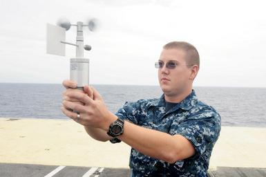 Keywords: US Navy 110826-N-AU622-016 Aerographers Mate Airman John Abbott measures wind speed and direction with an anemometer on the bow of the aircraft car.jpg en ATLANTIC OCEAN Aug 26 2011 Aerographers Mate Airman John Abbott measures wind speed and direction with an anemometer on the bow of the aircraft carrier USS Dwight D Eisenhower CVN 69 Dwight D Eisenhower is underway as a precaution due to the approach of Hurricane Irene The storm made landfall near Cape Lookout N C as a Category 1 hurricane with sustained winds of 85 miles-per-hour U S Navy photo by Mass Communication Specialist 3rd Class Nathan Parde/Released 2011-08-26 110826-N-AU622-016 Navy http //www navy mil/view_image asp id 106393 U S Navy photo by Mass Communication Specialist 3rd Class Nathan Parde PD-USGov-Military-Navy Aboard USS Dwight D Eisenhower CVN-69 |