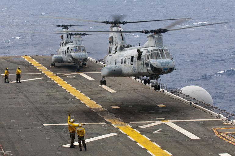Keywords: US Navy 111002-N-KM175-209 CH-46E Sea Knight helicopters assigned to Marine Medium Helicopter Squadron (HMM) 265 take off from the forward deployed.jpg en PHILIPPINE SEA Oct 2 2011 CH-46E Sea Knight helicopters assigned to Marine Medium Helicopter Squadron HMM 265 take off from the forward deployed amphibious assault ship USS Essex LHD 2 Essex is part of the Essex Amphibious Ready Group and is operating in the western Pacific Region U S Navy photo by Mass Communication Specialist 1st Class Terry Matlock/Released 2011-10-02 111002-N-KM175-209 Navy http //www navy mil/view_image asp id 108262 U S Navy photo by Mass Communication Specialist 1st Class Terry Matlock PD-USGov-Military-Navy Aboard USS Essex LHD-2 Marine Medium Helicopter Squadron 265 |