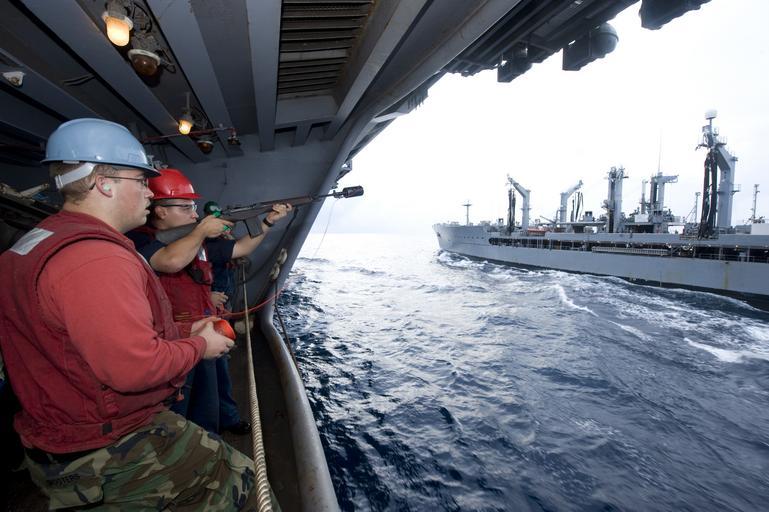| Keywords: US Navy 111020-N-IS680-004 irman Andrew Grooters from Grand Rapids, Mich., stands by as Gunner's Mate Seaman Apprentice Anthony Byers from Oroville.jpg en GULF OF THAILAND Oct 20 2011 Airman Andrew Grooters from Grand Rapids Mich stands by as Gunner's Mate Seaman Apprentice Anthony Byers from Oroville Calif fires a shot line from the aircraft carrier USS George Washington CVN 73 to the Military Sealift Command fleet replenishment oiler USNS Walter S Diehl T-AO 193 during a replenishment at sea George Washington is conducting a patrol in the western Pacific region U S Navy photo by Mass Communication Specialist Seaman Alysia Hernandez/Released 2011-10-20 111020-N-IS680-004 Navy http //www navy mil/view_image asp id 109363 U S Navy photo by Mass Communication Specialist Seaman Alysia Hernandez PD-USGov-Military-Navy Aboard USS George Washington CVN-73 |