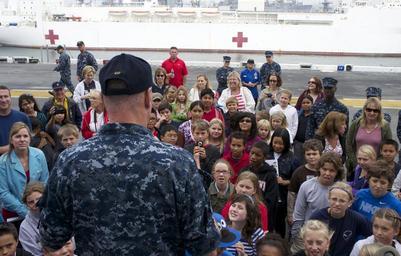 Keywords: US Navy 111021-N-ZC343-545 Capt. J. L. Harnden, commanding officer of the amphibious assault ship USS Bonhomme Richard (LHD 6), welcomes 5th grader.jpg en SAN DIEGO Oct 21 2011 Capt J L Harnden commanding officer of the amphibious assault ship USS Bonhomme Richard LHD 6 welcomes 5th graders aboard the ship from Gerald R Ford Elementary School in Indian Wells Calif Bonhomme Richard has maintained a partnership with the school for more than ten years U S Navy photo by Senior Chief Mass Communication Specialist Joe Kane/Released 2011-10-21 111021-N-ZC343-545 Navy http //www navy mil/view_image asp id 109326 U S Navy photo by Senior Chief Mass Communication Specialist Joe Kane PD-USGov-Military-Navy Aboard USS Bonhomme Richard LHD-6 Photographs by Joseph Kane |