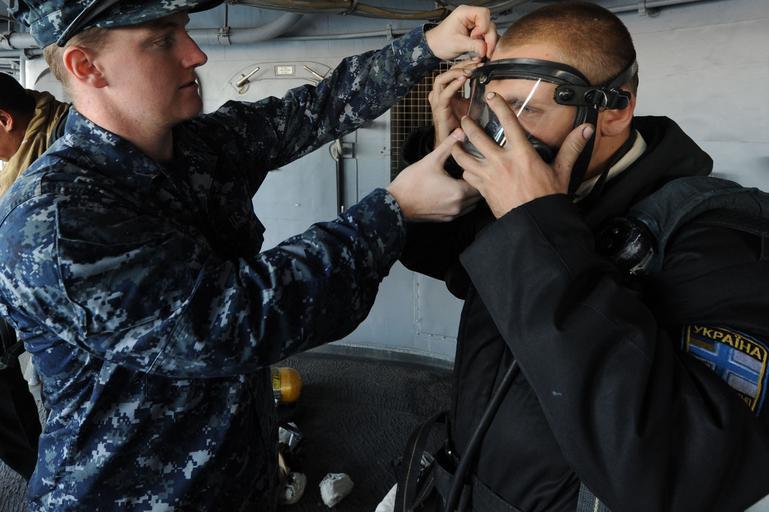 | Keywords: US Navy 111022-N-RB564-019 Hull Technician Fireman Justin Whipple shows Ukrainian Seaman Michel Mnua how to adjust the facemask on a self-contained.jpg en SEVASTOPOL Ukraine Oct 22 2011 Hull Technician Fireman Justin Whipple shows Ukrainian Seaman Michel Mnua how to adjust the facemask on a self-contained breathing apparatus during a shipboard firefighting course aboard the guided-missile destroyer USS Philippine Sea CG 58 Philippine Sea is on a three-day port visit to Sevastopol during a scheduled deployment in the Black Sea U S Navy photo by Mass Communication Specialist 2nd Class Gary Prill/Released 2011-10-22 111022-N-RB564-019 Navy http //www navy mil/view_image asp id 109403 U S Navy photo by Mass Communication Specialist 2nd Class Gary Prill PD-USGov-Military-Navy Aboard USS Philippine Sea CG-58 Self-contained breathing apparatus |