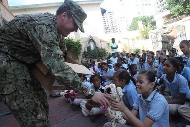 | Keywords: US Navy 111125-A-IP644-019 A Sailor distributes.jpg en SANTO DOMINGO Dominican Republic Nov 25 2011 Hospital Corpsman 3rd Class Adam Carlucci part of the Maritime Civil Affairs Team MCAT assigned to High Speed Vessel HSV 2 Swift distributes Loving Hugs stuffed animals to children at Hogar Escuela De Ninas Dona Chucha during a Southern Partnership Station community service event Swift has been working with military and community partners for the past three weeks to build partnerships throughout the country U S Army photo by Spc Jennifer Grier/Released 2011-11-25 111125-A-IP644-019 Navy http //www navy mil/view_image asp id 111050 U S Army photo by Spc Jennifer Grier PD-USGov-Military-Navy Images from US Navy location Santo Domingo Dominican Republic Children of the Dominican Republic |