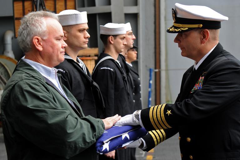 Keywords: US Navy 111209-N-XE109-085 A Sailor presents the national ensign.jpg en ATLANTIC OCEAN Nov 15 2011 Capt Brian E Luther right the commanding officer of USS George H W Bush CVN 77 presents the national ensign to Robert Moye the son of retired Navy Cmdr William Moye during a burial at sea ceremony held aboard the aircraft carrier William Moye is one of 1 200 friends and family members of the crew participating in a Tiger Cruise at the end of the ship's first combat deployment U S Navy photo by Mass Communication Specialist Seaman Brian Read Castillo/Released 2011-11-15 111209-N-XE109-085 Navy http //www navy mil/view_image asp id 112001 U S Navy photo by Mass Communication Specialist Seaman Brian Read Castillo PD-USGov-Military-Navy Aboard USS George H W Bush CVN-77 Brian E Luther |
