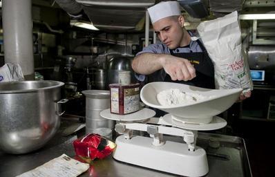 | Keywords: US Navy 111220-N-OY799-007 Culinary Specialist Seaman Matthew Ryback measures flour in preparation for the Christmas meal in the bake shop aboard t.jpg en ARABIAN GULF Dec 20 2011 Culinary Specialist Seaman Matthew Ryback measures flour in preparation for the Christmas meal in the bake shop aboard the Nimitz-class aircraft carrier USS John C Stennis CVN 74 John C Stennis is deployed to the U S 5th Fleet area of responsibility supporting Operation Enduring Freedom U S Navy photo by Mass Communication Specialist 3rd Class Kenneth Abbate/Released 2011-12-20 111220-N-OY799-007 Navy http //www navy mil/view_image asp id 112607 U S Navy photo by Mass Communication Specialist 3rd Class Kenneth Abbate PD-USGov-Military-Navy Food preparation aboard USS John C Stennis CVN-74 |