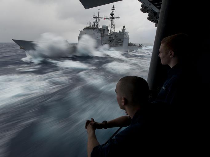 | Keywords: US Navy 111224-N-DR144-349 Hull Technician Fireman Douglas Anderson, left, and Hull Technician Fireman Patrick Zembol watch the Ticonderoga-class g.jpg en PACIFIC OCEAN Dec 24 2011 Hull Technician Fireman Douglas Anderson left and Hull Technician Fireman Patrick Zembol watch the Ticonderoga-class guided-missile cruiser USS Bunker Hill CG 52 take on fuel in heavy seas during a refueling at sea with the Nimitz-class aircraft carrier USS Carl Vinson CVN 70 Carl Vinson and Carrier Air Wing CVW 17 are underway on a western Pacific deployment U S Navy photo by Mass Communication Specialist 2nd Class James R Evans/Released 2011-12-24 111224-N-DR144-349 Navy http //www navy mil/view_image asp id 112721 U S Navy photo by Mass Communication Specialist 2nd Class James R Evans PD-USGov-Military-Navy USS Bunker Hill CG-52 Panning of vehicles Ships in heavy seas |