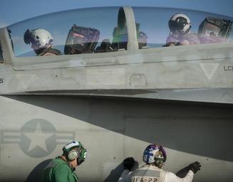 Keywords: US Navy 120130-N-DR144-139 Pilots ready for launch in an F-A-18F Super Hornet assigned to Strike Fighter Squadron (VFA) 22 on the flight deck aboar.jpg en ARABIAN SEA Jan 30 2012 Maintenance personnel prepare the aircraft as Capt Jeffrey Winter left deputy commander of Carrier Air Wing CVW 17 and Cmdr Paul C Spedero the Nimitz-class aircraft carrier USS Carl Vinson's CVN 70 executive officer ready for launch in an F/A-18F Super Hornet assigned to Strike Fighter Squadron VFA 22 on the flight deck aboard Carl Vinson Carl Vinson and Carrier Air Wing CVW 17 are deployed to the U S 5th Fleet area of responsibility U S Navy photo by Mass Communication Specialist 2nd Class James R Evans/Released 2012-01-30 120130-N-DR144-139 Navy http //www navy mil/view_image asp id 114305 U S Navy photo by Mass Communication Specialist 2nd Class James R Evans PD-USGov-Military-Navy Images from US Navy ship USS Carl Vinson's CVN 70 |