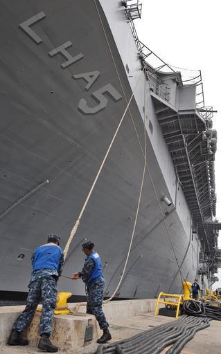 Keywords: US Navy 120207-N-GI544-011 Sailors at Naval Base San Diego release mooring lines as the amphibious assault ship USS Peleliu (LHA 5) gets underway.jpg en SAN DIEGO Feb 7 2012 Sailors at Naval Base San Diego release mooring lines as the amphibious assault ship USS Peleliu LHA 5 gets underway for exercise Iron Fist 2012 Iron Fist is a bilateral exercise between U S military forces and the Japan Self-Defense Force U S Navy photo by Mass Communication Specialist 3rd Class Laurie Dexter/Released 2012-02-07 120207-N-GI544-011 Navy http //www navy mil/view_image asp id 115237 U S Navy photo by Mass Communication Specialist 3rd Class Laurie Dexter PD-USGov-Military-Navy Aboard USS Peleliu LHA-5 |