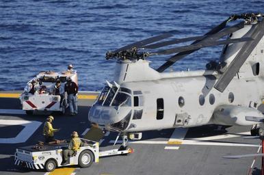 Keywords: US Navy 120208-N-ZZ999-013 Aviation boatswain's mates maneuver a CH-46 Sea Knight helicopter assigned to Marine Medium Helicopter Squadron (HMM) 36.jpg en SAN CLEMENTE ISLAND Calif Feb 8 2012 Aviation boatswain's mates maneuver a CH-46 Sea Knight helicopter assigned to Marine Medium Helicopter Squadron HMM 365 the Purple Foxes on the flight deck of the amphibious assault ship USS Peleliu LHA 5 Peleliu is participating in Iron Fist 2012 a training exercise between U S Marines and the Japan Ground Self-Defense Force designed to increase interoperability and amphibious capabilities throughout the U S 3rd and 7th Fleet areas of responsibility U S Navy photo by Mass Communication Specialist 3rd Class Ian Campbell/Released 2012-02-08 120208-N-ZZ999-013 Navy http //www navy mil/view_image asp id 115413 U S Navy photo by Mass Communication Specialist 3rd Class Ian Campbell PD-USGov-Military-Navy Aboard USS Peleliu LHA-5 CH-46 US Marine Corps Marine Medium Helicopter Squadron 365 |