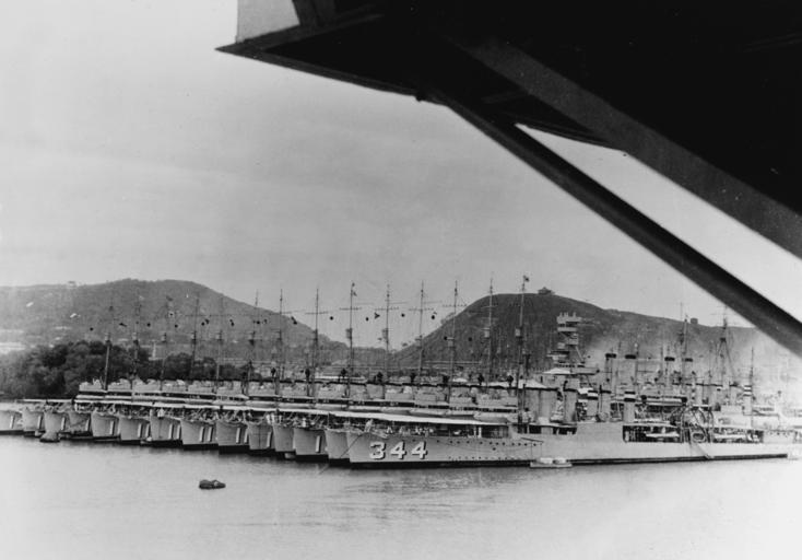 | Keywords: US Navy destroyers at Balboa, Panama, in 1934.jpg U S Navy destroyers moored together at Balboa Panama Canal Zone circa April 1934 Destroyers present include from right to left <br> USS William B Preston DD-344 <br> USS Preble DD-345 <br> USS Crowninshield DD-134 <br> USS Buchanan DD-131 <br> USS Aaron Ward DD-132 <br> USS Dent DD-116 <br> USS Waters DD-115 <br> USS Talbot DD-114 <br> USS Rathburne DD-113 <br> USS Lea DD-118 <br> USS Dorsey DD-117 <br> USS Hale DD-133 <br> USS Roper DD-147 and<br> USS Elliot DD-146 <br> The light cruiser USS Detroit CL-8 is in the right background Note the bands painted on the after smokestacks of William B Preston and Preble Official U S Navy photo http //www history navy mil/our-collections/photography/numerical-list-of-images/nhhc-series/nh-series/NH-49000/NH-49903 html NH 49903 from the U S Navy http //www history navy mil Naval History and Heritage Command ca 1934-04 Stahl U S Navy PD-USGov-Military-Navy USS Detroit CL-8 USS Rathburne DD-113 USS Talbot DD-114 USS Waters DD-115 USS Dent DD-116 USS Dorsey DD-117 USS Lea DD-118 USS Buchanan DD-131 USS Aaron Ward DD-132 USS Hale DD-133 USS Crowninshield DD-134 USS Elliot DD-146 USS Roper DD-147 USS William B Preston DD-344 ship 1919 USS Preble DD-345 United States Navy on the Panama Canal |