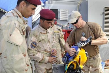 | Keywords: US Navy Diver Ryan Oakley explains the inner workings of a Kirby Morgan 37 diving helmet to Iraqi sailors.jpg  en UMM QASR Iraq May 16 2011 Chief Navy Diver Ryan Oakley assigned to Commander Task Group CTG 56 1 explains the inner workings of a Kirby Morgan 37 diving helmet to Iraqi sailors aboard the U S Army vessel Landing Craft Utility Five Forks LCU 2018 at the port of Umm Qasr during a joint effort between Iraqi divers and U S divers The divers are raising a sunken pier as part of the partnership strength and presence initiative U S Navy photo by Mass Communication Specialist 1st Class Peter D Lawlor/Released 2011-05-16 110516-N-WL435-439 Navy http //www navy mil/view_image asp id 101748 U S Navy photo by Mass Communication Specialist 1st Class Peter D Lawlor PD-USGov-Military-Navy Images from US Navy location Umm Qasr Iraq Navy of Iraq LCU 2018 Five Forks ship 1991 |