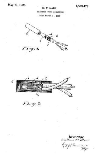 Keywords: US Patent 1583479.jpg en Electric-Wire Connecter US Patent 1583479 The Inventors claim isː- An electric wire connecter comprising a tubular metal member capable of receiving a multiplicity of wire ends a metal screw entering said member transversely and extending completely across the diameter of the bore thereof and adapted to clamp the wire ends securely together and against the wall of said tubular member and a separable closed tubular insulating member fitted over the metal tube and completely enclosing the perimeter of said tube and said screw 2014-04-13 03 27 14 http //www google com/patents/US1583479 U S Patent Office - inventor W P Marr PD-USGov Uploaded with UploadWizard Patent drawings U S Patent drawings Screw terminals |