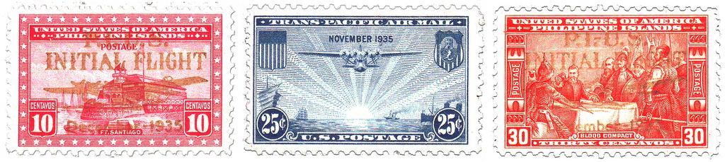 | Keywords: US and PI First Transpacific Air Mail Stamps 1935.jpg  US and Philippine Islands as US Commonwealth Air Mail stamps issued for the first commercial Transpacific flights Westbound US-PI and Eastbound PI-US between San Francisco CA Alameda and Manila PI November 22 - December 6 1935 US C20 China Clipper <small> blue </small> 1935 25 cents PI Ft Santiago 1935 10 centavos and Blood Compact 1935 30 Centavos overprinted in gold PI - US INITIAL FLIGHT December - 1935 with silhouette of Martin M-130 Pan American Airways flying boat China Clipper The Cooper Collection of US Aero Postal History <small> private collection </small> November 22 1935 C20 ; December 2 1935 PI Overprint US Post Office Department US Bureau of Engraving and Printing Stamps ; Bureau of Printing Manila overprinting on PI stamps PD-USGov Original upload log en wikipedia Patriot8790 page en wikipedia US_and_PI_First_Transpacific_Air_Mail_Stamps_1935 jpg 2009-06-14 21 56 Centpacrr 2874×642× 3136797 bytes <nowiki> Changed orientation from vertical to horizontal </nowiki> 2009-06-14 21 04 Centpacrr 970×1855× 3126612 bytes <nowiki> Stamps </nowiki> Pan American World Airways International air transport International mail Airmail stamps of the United States Blue stamps Red stamps Martin 130 |