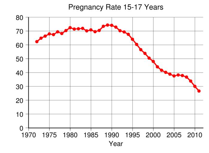 | Keywords: US Pregnancy Rate 15-17 Years.svg translate yes en Pregnancy rate per 1000 15-17 years old in the United States Data from http //www guttmacher org/pubs/USTPtrends10 pdf Table 2 2 pg 11 2015-01-23 own Delphi234 other versions Generated with Wikimedia SVG Chart SVG Chart/box cc-zero Human pregnancy |
