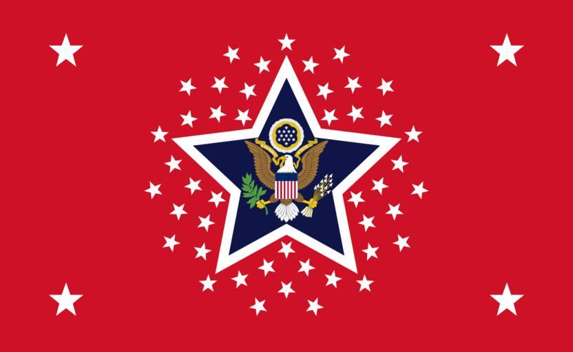 | Keywords: US Presidential Flag Army 1898.svg The Army's presidential flag from 1898 The Navy already had a presidential flag but the design was very close to the Army's infantry flag so they chose a completely different design The Army defined both a flag and a color; the color was the same design but smaller made of silk and had a fringe of silver and gold The flag was technically replaced with the Navy version in 1901 but the use of the color continued along with the other flag design until they were both replaced by a new flag designed during President Wilson's term in 1916 The flag was designed by Frederick D Owen a civilian working in the War Department The regulation which officially defined the flag was General Orders No 13 issued on March 28 1898 It read http //www tioh hqda pentagon mil/SealsEmblems/PresidentOfTheUnitedStates htm <blockquote> 212a The flag of the President shall be of scarlet bunting measuring 13 feet fly and 8 feet hoist having a hem on the hoist 3 inches wide and provided with an eyelet at each end for hoisting and lowering In each of the four corners shall be a five-pointed white star with one point upward The points of these stars lie in the circumference of an imaginary circle of 5 inches radius The centers of these imaginary circles which coincide with the centers of these stars are 18 inches from the short sides and 14 inches from the long sides of the flag In the center of the flag shall be a large fifth star also of five points which lie in the circumference of an imaginary circle of 2 feet 9 inches radius The center of this circle is the point of intersection of the diagonals of the flag The re-entering angles of this large star lie in the circumference of an imaginary circle of 16 inches radius with the same center as before Inside of the star thus outlined is a parallel star separated from it by a band of white 3 inches wide This inner star forms a blue field upon which is the official coat of arms of the United States as determined by the State Department the device being located by placing the middle point of the line dividing the chief from the paleways of the escutcheon upon the point of intersection of the diagonals of the flag and thus coinciding with the center of the large center star On the scarlet field around the large star are other white stars one for each State equally scattered in the re-entering angles and all included within the circumference of a circle of 3 feet 3 inches radius whose center is the center of the large star </blockquote> The color was defined the same way <blockquote> 214b Of scarlet silk 6 feet 6 inches fly and 4 feet on the pike which shall be 10 feet long including ferrule and head The head shall consist of a globe 3 inches in diameter surmounted by an American eagle alert 4 inches high In each of the four corners shall be a five pointed white star The points of these stars lie in the circumference of an imaginary circle of 2 ½ inches radius The centers of these imaginary circles which coincide with the centers of these stars are 9 inches from the short sides and 7 inches from the long sides of the color In the center of the color shall be a large fifth star also of five points which lie in the circumference of an imaginary circle of 16 ½ inches radius The center of this circle is the point of intersection of the diagonals of the color The re-entering angles of this large star lie in the circumference of an imaginary circle of 8 inches radius with the same center as before Inside of the star thus outlined is a parallel star separated from it by a band of white 1 ½ inches wide This inner star forms a blue field upon which is the official coat of arms of the United States as determined by the State Department the device being located by placing the middle point of the line dividing the chief from the paleways of the escutcheon upon the point of intersection of the diagonals of the color and thus coinciding with the center of the large center star On the scarlet field around the large star are other white stars one for each State equally scattered in the re-entering angles and all included within the circumference of a circle of 19 ½ inches radius whose center is the center of the large star The design letters figures and stars are to be embroidered in silk the same on both sides of the colors The edges of the color are to be trimmed with knotted fringe of silver and gold 3 inches wide and one cord having two tassels 8 feet 6 inches long and made of red white and blue silk intermixed </blockquote> Self-made following the precise dimensions from the original specifications SVG Great Seal taken from File US-OfficeOfManagementAndBudget-Seal svg a U S Government work and slightly altered and colorized to match version of actual flag seen in File Army Presidential Flag QMMuseum jpg 1898 U S Government <gallery> File Army Presidential Flag QMMuseum jpg Photo of 1908 version of the color with 46 stars File US Presidential Flag Navy 1899 svg Navy presidential flag File US Presidential Color Army 1912 svg Updated design from 1912 </gallery> PD-USGov Flag of the President of the United States 8 Personal flags of the United States Army SVG flags - military of the United States SVG flags - historical of the United States Blue green red white yellow flags E Pluribus Unum Flags with arrows Flags with banners Flags with branches Flags with one blue star Flags with eagles Flags with more than twenty stars Flags with mottos Flags with white five-pointed stars Five-pointed stars |