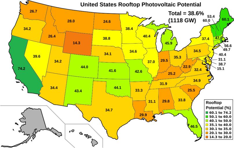 | Keywords: US rooftop photovoltaics potential.svg en US rooftop photovoltaics potential Most states could obtain from 30 to 50 of all electricity used from rooftop photovoltaics The lowest is Wyoming at 14 3 and the highest is California at 74 2 It is estimated that rooftop solar panels could generate 1432 TWh/year in the United States 38 6 of the total Alaska and Hawaii are not included Efficiency was assumed to be 16 and if 20 panels are used the potential is increased by 25 http //www nrel gov/news/press/2016/24662 Data 2016-03-31 own Delphi234 other versions cc-zero United States solar power resources |