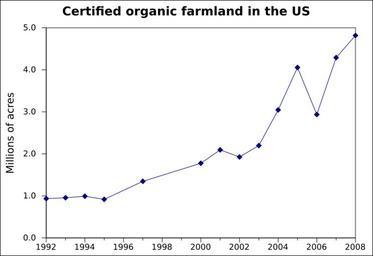 | Keywords: USA organic farmland 1992-2008.svg  Check categories 2012 December 4 en Graph of total U S certified organic farmland acreage from 1992-2008 2011-11-27 own Data source USDA Economic Research Service based on information from USDA-accredited State and private organic certifiers Jacob Welsh DrTrigonBot <span class signature-talk >talk</span> FileContentsByBot/ColorRegions FileContentsByBot/ColorRegions 1 000 0 023 PMS 11-0601 TPX Bright White Pantone 241 242 241 1 713 245 245 245 1 000 0 0 455 313 1 004 1 227 156 FileContentsByBot/ColorAverage 0 022 PMS 11-0601 TPX Bright White Pantone 241 242 241 0 058 246 245 245 1 362 FileContentsByBot/Properties - 459 316 Valid SVG image/svg+xml 48219 - cc-zero Categorized by DrTrigonBot Graphics Uploaded with UploadWizard |