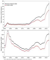 | Keywords: USdebt.svg en United States debt from 1940 to 2015 Red lines indicate the debt held by the public net public debt and black lines indicate the total federal debt gross federal debt the difference being that the gross debt includes that held by the federal government itself The second panel shows the two debt figures as a percentage of U S GDP dollar value of U S economic production for that year The top panel is in 2015 dollars Data source is OMB Historical Tables https //www whitehouse gov/sites/default/files/omb/budget/fy2017/assets/hist07z1 xls Table 7 1 2016-03-16 own Delphi234 other versions cc-zero Debt-to-GDP ratio of the United States |