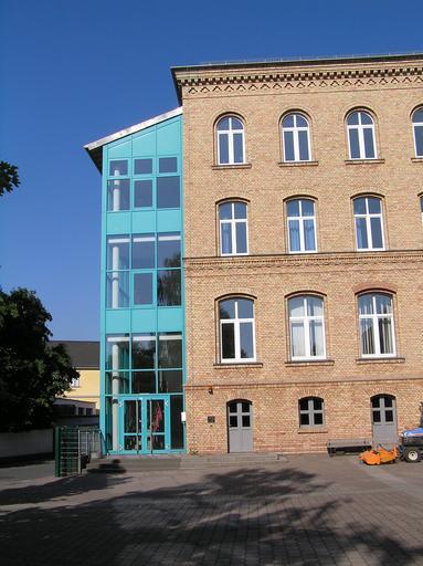 | Keywords: Usingen CWS Treppenhaus im Seitenflügel.JPG en Usingen Castle today Christian Wirth School in Usingen Hesse Germany de Usinger Schloss heute Christian Wirth Schule Usingen Das Bild zeigt das an den rechten Seitenflügel angebaute Treppenhaus vom Schulhof aus gesehen Die verwendeten Materialien und Farbe stellen einen bewußten Bruch mit der Backsteinoptik des Hauptgebäudes dar own Karsten11 2009-05-24 Usinger Schloss | ||||