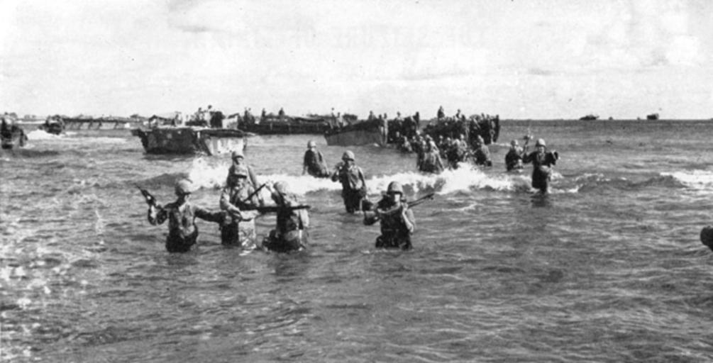 | Keywords: USMC-M-Tinian-p70.jpg en U S Marines have left the Amtracs wadding and ashore around the coral reef edge to overcome de US-Marines haben die Amtracs verlassen und watten an Land um die Korallenriffkante zu überwinden http //www ibiblio org/hyperwar/USMC/USMC-M-Tinian/ US-Navy 1944-07-23 PD-USGov-Military-Navy Battle of Tinian |
