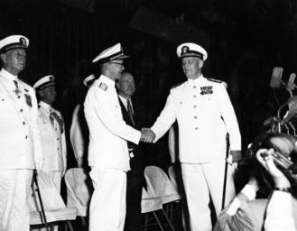 | Keywords: blackandwhite monochrome black and white USN 469741: The old and new, Admiral Arleigh A. Burke, USN, (right), new Chief of Naval Operations, is congratulated upon his promotion by the retiring Chief of Naval Operations, Admiral Robert B. Carney, during change of command ceremonies at the Naval Academy’s Dahlgren Hall on August 17, 1955. The honorable Charles S. Thomas, Secretary of the Navy, looks on during the ceremony. U.S. Navy photograph, now in the collections of the National Archives. (2016/03/03). USN 469741: The old and new, Admiral Arleigh A. Burke, USN, (right), new Chief of Naval Operations, is congratulated upon his promotion by the retiring Chief of Naval Operations, Admiral Robert B. Carney, during change of command ceremonies at the Naval Academy’s Dahlgren Hall on August 17, 1955. The honorable Charles S. Thomas, Secretary of the Navy, looks on during the ceremony. U.S. Navy photograph, now in the collections of the National Archives. (2016/03/03). |