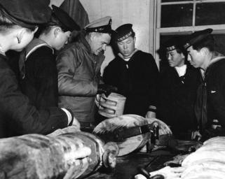 Keywords: USN Boatswain's mate Brewer instructs ROK sailors on a block and tackle.jpg Photo NH 97150 Republic of Korea Navy Service Schools Chief Boatswain's mate Joe E Brewer USN shows these interested looking ROK sailors the workings of block and tackle -- all part of seamanship Chief Brewer is the Advisor at the Boatswain's mate school Photograph and caption were released by Commander Naval Forces Far East under date of 27 February 1952 The sailors' cap ribbons read in translation Republic of Korea Navy The two bands in right-center read from left to right That at far right reads from right to left Official U S Navy Photograph from the All Hands collection at the Naval Historical Center http //www history navy mil/photos/images/h97000/h97150 jpg 1952-02-27 US Navy PD-USGov-Military-Navy original upload log wikitable date/time username resolution size edit summary ---- 17 21 13 March 2008 User Mbdortmund 740×590 85 KB <nowiki></nowiki> ---- 10 54 9 December 2007 User Bin2k1 740×615 95 KB <nowiki> Photo NH 97150 Republic of Korea Navy Service Schools Chief Boatswain's mate Joe E Brewer USN shows these interested looking ROK sailors the workings of block and tackle -- all part of seamanship Chief Brewer i</nowiki> Sailors of the Republic of Korea Navy Sailor caps Military people on duty Seamanship People wearing uniforms Black and white photographs of men Black and white photographs of the United States Boatswain's Mate United States Navy Retouched by Mbdortmund |