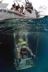 | Keywords: USNS-Grasp-Diver-On-Stage.jpg en A diver rides a stage to the sea bed from MSC rescue and salvage ship USNS Grasp in St Kitts during Global Fleet Station 2008 Photo by MCCS Andrew McKaskle http //www msc navy mil/annualreport/2008/subcommands htm U S Navy MCCS Andrew McKaskle 100px PD-USGov-Military-Navy Aboard USNS Grasp T-ARS-51 Underwater photographs of surface supplied divers Saint Kitts and Nevis Over/under photographs Diving support vessels Diving stages | ||||