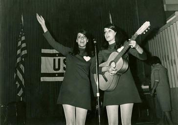 | Keywords: USO Audition for Vietnam Tour 1968 Jennie and Terrie Frankel.jpeg en Jennie and Terrie Frankel early Doublemint Twins auditioning at USO United Service Organization in Downtown Chicago in the fall of 1968 for a November/December 1968 USO tour to Vietnam Pictured in dresses with hearts they are singing a folk song Terrie is playing the guitar 1968 Fall own TwinsofSedona other versions Chicago Illinois cc-zero Uploaded with UploadWizard Doublemint Twins Jennie and Terrie Frankel USO Vietnam Historical images of Chicago Twin sisters Vietnam United Service Organizations Terrie Frankel Jennie Frankel |