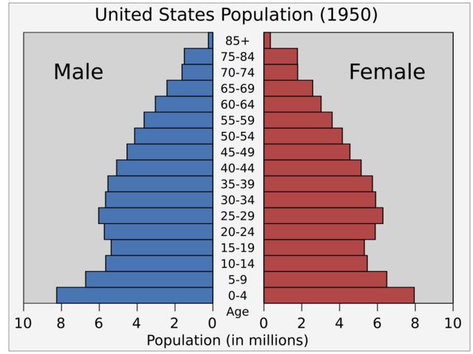 Keywords: USpop-1950.svg translate yes en Population pyramid - United States 1950 Data source U S Census Bureau 1950 census https //www census gov/prod/www/decennial html 2014-07-25 own Delphi234 Data wikitable - colspan 4 1950 - Age Total Male Female - 0-4 16 196 536 8 253 314 7 943 222 - 4-9 13 216 535 6 723 200 6 493 335 - 10-14 11 125 643 5 663 944 5 461 699 - 15-19 10 680 823 5 373 442 5 307 381 - 20-24 11 621 548 5 736 713 5 884 835 - 25-29 12 323 490 6 034 048 6 289 442 - 30-34 11 577 157 5 671 758 5 905 399 - 35-39 11 281 256 5 544 769 5 736 487 - 40-44 10 224 283 5 086 329 5 137 954 - 45-49 9 081 620 4 535 231 4 546 389 - 50-54 8 279 203 4 134 608 4 144 595 - 55-59 7 238 885 3 633 251 3 605 634 - 60-64 6 061 325 3 039 323 3 022 002 - 65-69 5 003 621 2 425 036 2 578 585 - 70-74 3 412 164 1 628 959 1 783 205 - 75-84 3 277 906 1 506 801 1 771 105 - 85+ 576 911 236 828 340 083 - Total 151 178 906 75 227 554 75 951 352 cc-zero Uploaded with UploadWizard Population pyramids of the United States |