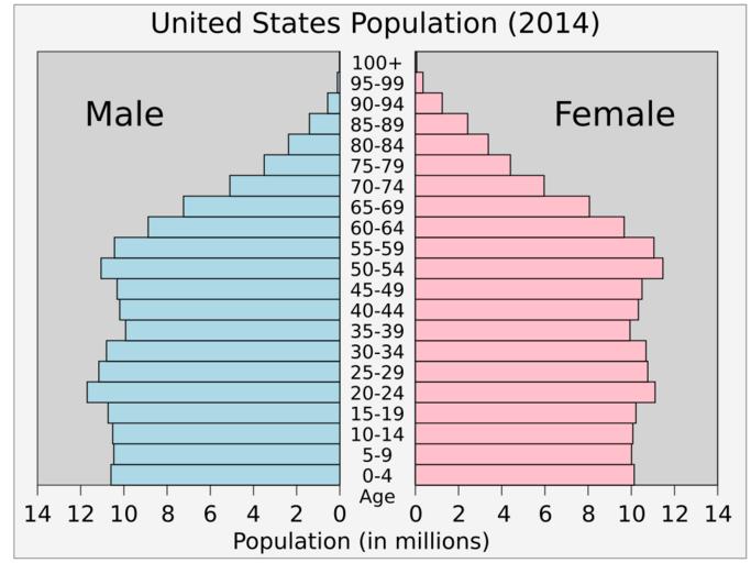 | Keywords: Uspop.svg translate yes Population pyramid - United States 2014 Data source U S Census Bureau http //www census gov/population/international/data/idb/informationGateway php IDB Population Pyramids Graph created by User Kmf164 Data wikitable - colspan 4 2014 - Age Total Male Female - 0-4 24 115 355 12 329 026 11 786 329 - 5-9 23 983 033 12 265 815 11 717 218 - 10-14 23 682 367 12 119 006 11 563 361 - 15-19 23 642 111 12 120 034 11 522 077 - 20-24 24 462 506 12 589 747 11 872 759 - 25-29 25 492 660 13 115 275 12 377 385 - 30-34 25 948 912 13 322 047 12 626 865 - 35-39 25 512 918 13 069 258 12 443 660 - 40-44 24 654 594 12 586 067 12 068 527 - 45-49 24 261 918 12 336 986 11 924 932 - 50-54 23 866 369 12 094 754 11 771 615 - 55-59 24 093 805 12 145 292 11 948 513 - 60-64 22 348 288 11 081 219 11 267 069 - 65-69 20 144 338 9 766 755 10 377 583 - 70-74 17 409 985 8 252 505 9 157 480 - 75-79 15 242 595 6 998 129 8 244 466 - 80-84 12 963 167 5 723 165 7 240 002 - 85-89 9 957 954 4 084 860 5 873 094 - 90-94 5 593 835 2 050 801 3 543 034 - 95-99 1 984 879 610 995 1 373 884 - 100+ 441 780 107 817 333 963 - Total 318 892 103 157 082 861 161 809 242 Population pyramids of the United States |