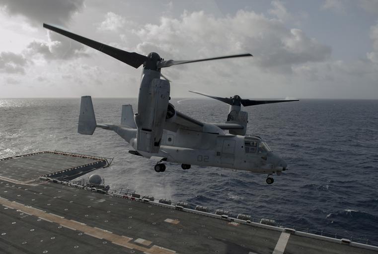 Keywords: USS America operations 140723-N-LQ799-051.jpg en A tilt-rotor MV-22 Osprey assigned to the Argonauts of Marine Operational Test and Evaluation Squadron VMX 22 takes off from the flight deck of future amphibious assault ship USS America LHA 6 during flight operations America is currently traveling through the U S Southern Command and U S 4th Fleet area of responsibility on her maiden transit America Visits the Americas America is the first ship of its class replacing the Tarawa-class of amphibious assault ships As the next generation big-deck amphibious assault ship America is optimized for aviation capable of supporting current and future aircraft such as the Osprey and F-35B Joint Strike Fighter The ship is scheduled to be ceremoniously commissioned Oct 11 in San Francisco U S Navy photo by Mass Communication Specialist 1st Class Lewis Hunsaker/Released 2014-07-23 Petty Officer 1st Class Lewis Hunsaker https //www dvidshub net/image/1463736 140723-N-LQ799-051 2014-07-24 23 55 USAFRICOM AT SEA PD-USGov-Military-Navy MV-22B Osprey USS America LHA-6 Images from DoD uploaded by Fæ