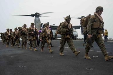 | Keywords: USS Bonhomme Richard flight deck operations 150331-N-RU971-035.jpg en 150331-N-RU971-035 WATERS TO THE EAST OF THE KOREAN PENINSULA An MV-22 Osprey tiltrotor aircraft offloads Marines assigned to the 31st Marine Expeditionary Unit returning from the Korean Marine Exchange Program on the flight deck of the forward-deployed amphibious assault ship USS Bonhomme Richard U S Sailors and Marines from the Bonhomme Richard Amphibious Ready Group and the 31st MEU are participating in the Korean Marine Exchange Program in the Republic of Korea with the ROK marine corps and navy The Bonhomme Richard ARG is comprised of the amphibious assault ship USS Bonhomme Richard the amphibious transport dock ship USS Green Bay the Whidbey-island class amphibious dock landing ship USS Ashland and the embarked 31st MEU 2015-03-31 March 31 2015 https //www dvidshub net/image/1847965 150331-N-RU971-035 2015-03-31 07 58 USS BONHOMME RICHARD WATERS TO THE EAST OF THE KOREAN PENINSULA AT SEA PD-USGov-Military-Navy MV-22B Osprey 31st Marine Expeditionary Unit USS Bonhomme Richard LHD-6 USS Green Bay LPD-20 Images from DoD uploaded by FĂŚ |