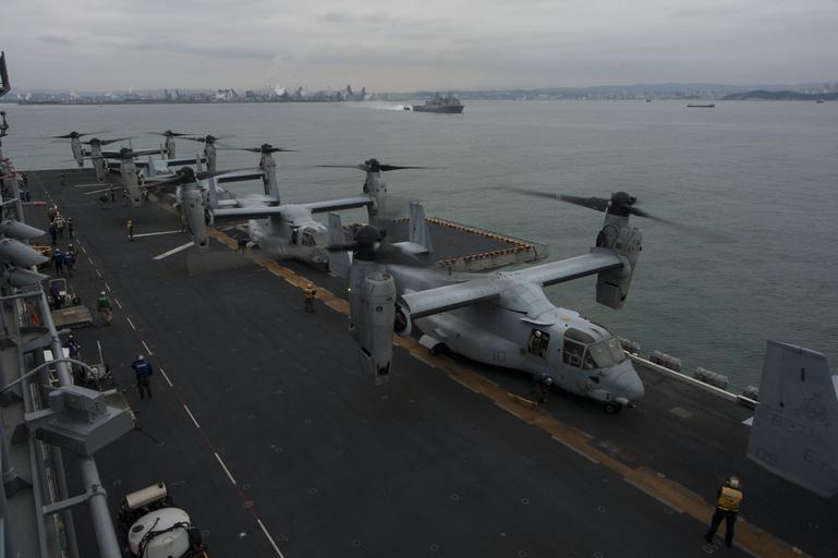 | Keywords: USS Bonhomme Richard operations 150402-N-RU971-417.jpg en 150402-N-RU971-417 WATERS TO THE EAST OF THE KOREAN PENINSULA MV-22 Osprey tiltrotor aircraft assigned to Marine Medium Tiltrotor Squadron 262 262 prepare to take off from the flight deck of the forward-deployed amphibious assault ship USS Bonhomme Richard as a Landing Craft Air Cushion propels through the water towards the amphibious transport dock ship USS Green Bay Green Bay is a part of the Bonhomme Richard Amphibious Ready Group and along with the embarked 31st Marine Expeditionary Unit is currently underway in the 7th Fleet Area of Operations 2015-04-02 April 2 2015 https //www dvidshub net/image/1852353 150402-N-RU971-417 2015-04-02 06 23 WATERS EAST OF KOREA USS BONHOMME RICHARD AT SEA PD-USGov-Military-Navy MV-22B Osprey 31st Marine Expeditionary Unit USS Bonhomme Richard LHD-6 USS Green Bay LPD-20 Images from DoD uploaded by FĂŚ |