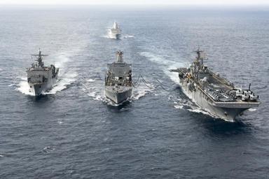 | Keywords: USS Bonhomme Richard, Replenishment at sea 150311-N-RU971-176.jpg en 150311-N-RU971-176 EAST CHINA SEA The Whidbey-island class amphibious dock landing ship USS Ashland the amphibious transport dock ship USS Green Bay and the forward-deployed amphibious assault ship USS Bonhomme Richard participate in a replenishment-at-sea with fleet replenishment oiler USNS Pecos Bonhomme Richard Ashland and Green Bay are part of the Bonhomme Richard Amphibious Ready Group and along with the embarked 31st Marine Expeditionary Unit are currently conducting an Amphibious Integration Training exercise 2015-03-11 March 11 2015 https //www dvidshub net/image/1810352 150311-N-RU971-176 2015-03-12 01 48 USS BONHOMME RICHARD EAST CHINA SEA AT SEA PD-USGov-Military-Navy 31st Marine Expeditionary Unit USS Bonhomme Richard LHD-6 USS Green Bay LPD-20 Images from DoD uploaded by FĂŚ |