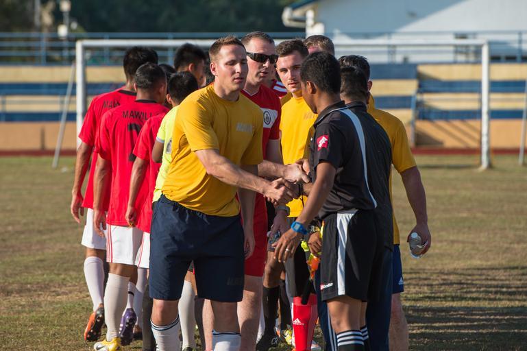 | Keywords: USS Bonhomme Richard sailors play soccer in Malaysia 150224-N-UF697-416.jpg en 150224-N-UF697-416 SEPANGGAR Malaysia Feb 24 2015 Sailors and Marines assigned to the forward-deployed amphibious assault ship USS Bonhomme Richard LHD 6 shake hands with sailors from the Royal Malaysian navy after soccer game during a scheduled port visit Bonhomme Richard is the lead ship of the Bonhomme Richard Amphibious Ready Group comprised of USS Ashland LSD 48 USS Germantown LSD 42 and the newest member USS Green Bay LPD 20 The purpose of the port call in Malaysia is to continue to build key diplomatic and military relationships and to illustrate the U S Navy ™s commitment to broadening the robust ties with their regional Asia-Pacific partners During Bonhomme Richard ™s visit the crew will engage in community relations events and sports activities and will host tours of the ship for the local residents U S Navy photo by Mass Communication Specialist 3rd Class Kevin V Cunningham/Released 2015-02-24 Petty Officer 3rd Class Kevin Cunningham https //www dvidshub net/image/1794534 150224-N-UF697-416 2015-03-03 02 55 SEPANGGAR MY PD-USGov-Military-Navy USS Ashland LSD-48 USS Bonhomme Richard LHD-6 USS Germantown LSD-42 USS Green Bay LPD-20 Images from DoD uploaded by Fæ |