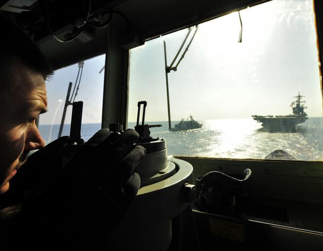 | Keywords: USS Bunker Hill action DVIDS358696.jpg en Ensign Livy Coe shoots a bearing off the aircraft carrier USS Carl Vinson right aboard the guided-missile cruiser USS Bunker Hill during a transiting exercise with the Republic of Korea navy destroyers ROKS Dae Jo Yeong and ROKS Kwangyaeto Dae Wang Bunker Hill and Carrier Strike Group 1 are on a scheduled deployment to the U S 7th Fleet area of responsibility 2011-01-14 https //www dvidshub net/image/358696 110114-N-+++++-001 2011-01-18 21 02 USS BUNKER HILL AT SEA PD-USGov-Military-Navy USS Carl Vinson CVN-70 Images from DoD uploaded by Fæ |