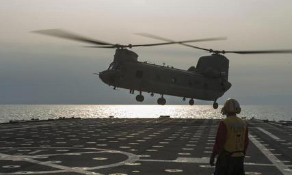 | Keywords: USS Denver flight operations 140411-N-ZU025-203.jpg en A CH-47F Chinook tandem rotor heavy-lift helicopter from 3rd General Support Aviation Battalion 2nd Combat Aviation Brigade 2nd Infantry Division takes off from the flight deck of the amphibious transport dock ship USS Denver during flight operations Denver is part of the Bonhomme Richard Amphibious Ready Group and is conducting joint force amphibious operations in the U S 7th Fleet area of operations with the 31st Marine Expeditionary Unit and Commander Amphibious Squadron 11 2014-04-11 LPD 9 https //www dvidshub net/image/1241401 140411-N-ZU025-203 2014-04-11 20 54 EAST CHINA SEA AT SEA PD-USGov-Military-Navy CH-47 Chinook 31st Marine Expeditionary Unit Images from DoD uploaded by Fæ |