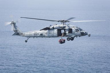Keywords: USS Dwight D. Eisenhower Deployment 160824-N-EO381-464.jpg en 160824-N-EO381-464 ARABIAN GULF Aug 24 2016 An aircrew member assigned to the Dusty Dogs of Helicopter Sea Combat Squadron HSC 7 guides a litter with search and rescue swimmers during an exercise Ike and its Carrier Strike Group are deployed in support of Operation Inherent Resolve maritime security operations and theater security cooperation efforts in the U S 5th Fleet area of operations U S Navy photo by Mass Communication Specialist 3rd Class Casey J Hopkins <br>Unit Navy Media Content Services 2016-08-24 Petty Officer 3rd Class Casey Hopkins https //www dvidshub net/image/2818921/uss-dwight-d-eisenhower-deployment 160824-N-EO381-464 2016-08-26 00 16 CVN 69 AR PD-USGov-Military-Navy USS Dwight D Eisenhower CVN-69 Images from DoD uploaded by Fæ Helicopter Sea Combat Squadron 7 United States Navy 2016 in aviation in the United States Operation Inherent Resolve Helicopters facing right SH-60F Seahawk in flight Aviation files check needed |