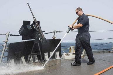 Keywords: USS Farragut freshwater washdown 150425-N-VC236-020.jpg en 150425-N-VC236-020 ARABIAN GULF - A Sailor assigned to the guided-missile destroyer USS Farragut clean the ship's aft missile deck during a freshwater washdown The wash down helps prevent corrosion of the ship's metal due to exposure to salt water Farragut is deployed to the U S 5th Fleet area of operations conducting maritime security operations 2015-04-25 April 25 2015 https //www dvidshub net/image/1900906 150425-N-VC236-020 2015-04-28 00 02 USS FARRAGUT ARABIAN GULF AT SEA 3 PD-USGov-Military-Navy USS Farragut DDG-99 Images from DoD uploaded by Fæ |