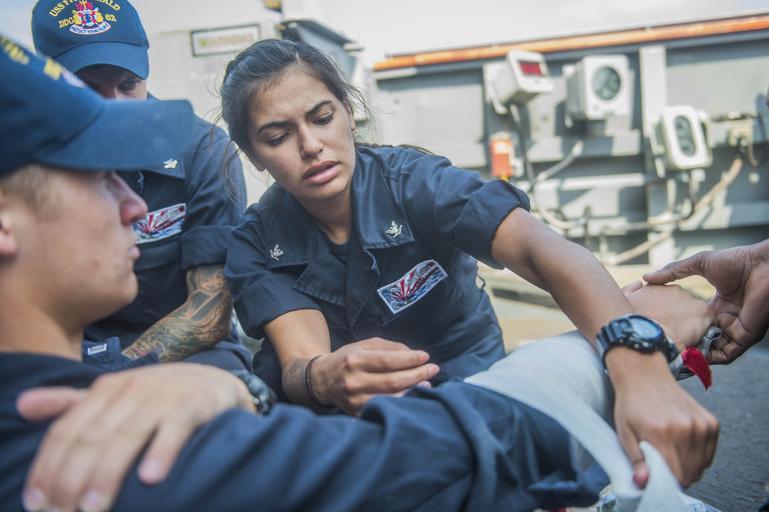 MAKE A MEME View Large Image Fitzgerald operations 150413-N-XM324-040.jpg en 150413-N-XM324-040 SOUTH CHINA SEA April 13 2015 Quartermaster 3rd Class Christina Casillas right from San Antonio applies a splint to a simulated broken arm during a medial drill on board ...