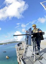 | Keywords: USS Frank Cable 130603-N-CO162-045.jpg  en Gunner's Mate 2nd Class Caleb French stands watch at the forward port side 50-caliber machine gun station aboard the submarine tender USS Frank Cable AS 40 during sea-and-anchor maneuvering Frank Cable forward deployed to the island of Guam conducts maintenance and support of submarines and surface vessels deployed in the U S 7th Fleet area of responsibility U S Navy photo by Mass Communication Specialist 3rd Class Chris Salisbury/Released 2013-06-03 Christopher Salisbury https //www dvidshub net/image/945856 130603-N-CO162-045 2013-06-03 21 08 POLARIS POINT GU PD-USGov-Military-Navy USS Frank Cable AS-40 Images from DoD uploaded by Fæ Browning M2 of the US Navy |