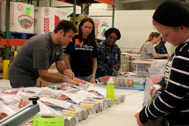 MAKE A MEME View Large Image Bush 120920-N-FE409-045.jpg en Miles Monroe left Backpack Program production coordinator demonstrates the correct order to package food items to U S Sailors assigned to the aircraft carrier USS George H W Bush CVN 77 at the Foodbank of ...