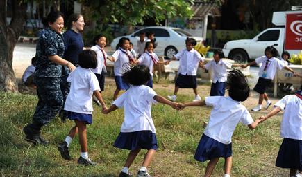 | Keywords: USS Germantown builds relationship with Thai School 120223-N-LP801-085.jpg en Engineman 3rd Class Ia Vang left and Engineman 3rd Class Victoria Moore assigned to the forward-deployed amphibious dock landing ship USS Germantown hold hands with Thai children while participating in a community service project during a port visit to the Kingdom of Thailand Germantown with embarked elements of the 31st Marine Expeditionary Unit is currently underway after participating in exercise Cobra Gold 2012 an annual Thai-U S co-sponsored joint and multinational exercise designed to advance security throughout the Asia-Pacific region and enhance interoperability with participating nations U S Navy photo by Mass Communication Specialist Seaman Raul Moreno Jr 2012-02-23 Seaman Raul Moreno Jr https //www dvidshub net/image/531242 120223-N-LP801-085 2012-02-25 08 05 TH PD-USGov-Military-Navy 31st Marine Expeditionary Unit Images from DoD uploaded by Fæ |