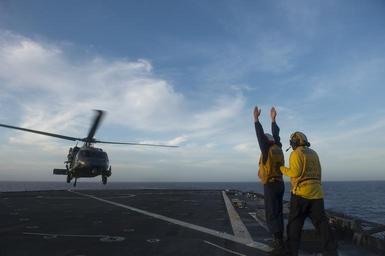 Keywords: USS Germantown operations 130622-N-KL846-138.jpg en Midshipman 1st Class Michael Madrid signals an Air Force HH-60G Pave Hawk helicopter assigned to the 33rd Rescue Squadron to take off from the amphibious dock landing ship USS Germantown LSD 42 Germantown is conducting a patrol with the Bonhomme Richard Amphibious Ready Group ARG in the U S 7th Fleet area of responsibility U S Navy photo by Mass Communication Specialist 3rd Class Christopher Lindahl/Released 2013-06-22 Petty Officer 2nd Class Christopher Lindahl https //www dvidshub net/image/1674487 130622-N-KL846-138 2014-11-24 06 25 EAST CHINA SEA AT SEA PD-USGov-Military-Navy USS Germantown LSD-42 Images from DoD uploaded by Fæ