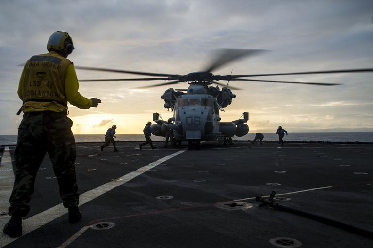 | Keywords: USS Germantown operations 141031-N-XM324-174.jpg  en Boatswain ™s Mate 2nd Class Brian Potter from Buffalo N Y signals to the pilot of a CH-53E Super Stallion helicopter assigned to the Flying Tigers of Marine Heavy Helicopter Squadron HMH 361 while Sailors chock and chain the helicopter on the flight deck of the amphibious dock landing ship USS Germantown LSD 42 during exercise Blue Chromite Blue Chromite is an amphibious training exercise with the 4th Marine Regiment and the 2nd Battalion 9th Marines Germantown is part of the Peleliu Amphibious Ready Group PELARG14 commanded by Capt Heidi Agle and is conducting joint forces exercises in the U S 7th Fleet area of responsibility U S Navy photo by Mass Communication Specialist Seaman Patrick Dionne/Released 2014-10-31 Seaman Apprentice Patrick Dionne https //www dvidshub net/image/1649207 141031-N-XM324-174 2014-11-07 23 16 PHILIPPINE SEA AT SEA PD-USGov-Military-Navy Sikorsky CH-53E Super Stallion 2nd Battalion 9th Marines USS Germantown LSD-42 Images from DoD uploaded by Fæ |